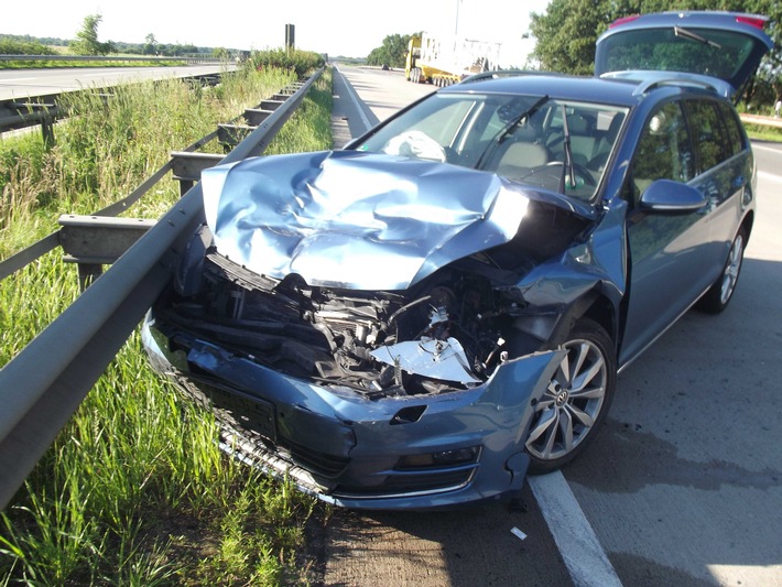Ein 32-jähriger Bremer befuhr die Autobahn in Richtung Cuxhaven. An der Anschlussstelle kam er vermutlich aufgrund von Übermüdung mit seinem Kombi nach rechts von der Fahrbahn ab und geriet leicht in den Seitenraum. Von dort aus fuhr er weiter, geriet auf den Beschleunigungsstreifen der Anschlussstelle und kollidierte dort mit dem Passat einer 48-Jährigen aus Bad Bederkesa, die auf die Autobahn auffahren wollte.